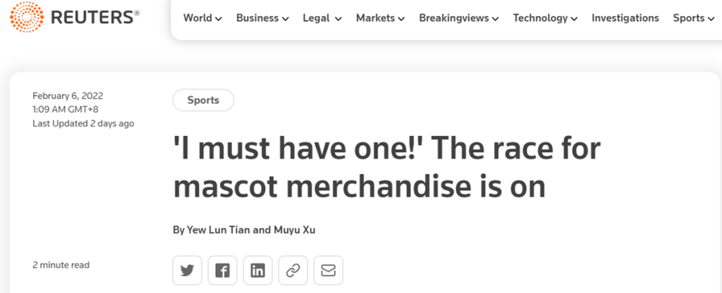 <“I must have one!”The race for mascot merchandise is on> <Panda-monium: From medal podiums to spectator stands, Winter Olympics mascot Bing Dwen Dwen is everywhere>…Reuters, CNN, and other foreign media have also recently reported the popularity of the Beijing Winter Olympics mascot “Bing Dwen Dwen”.